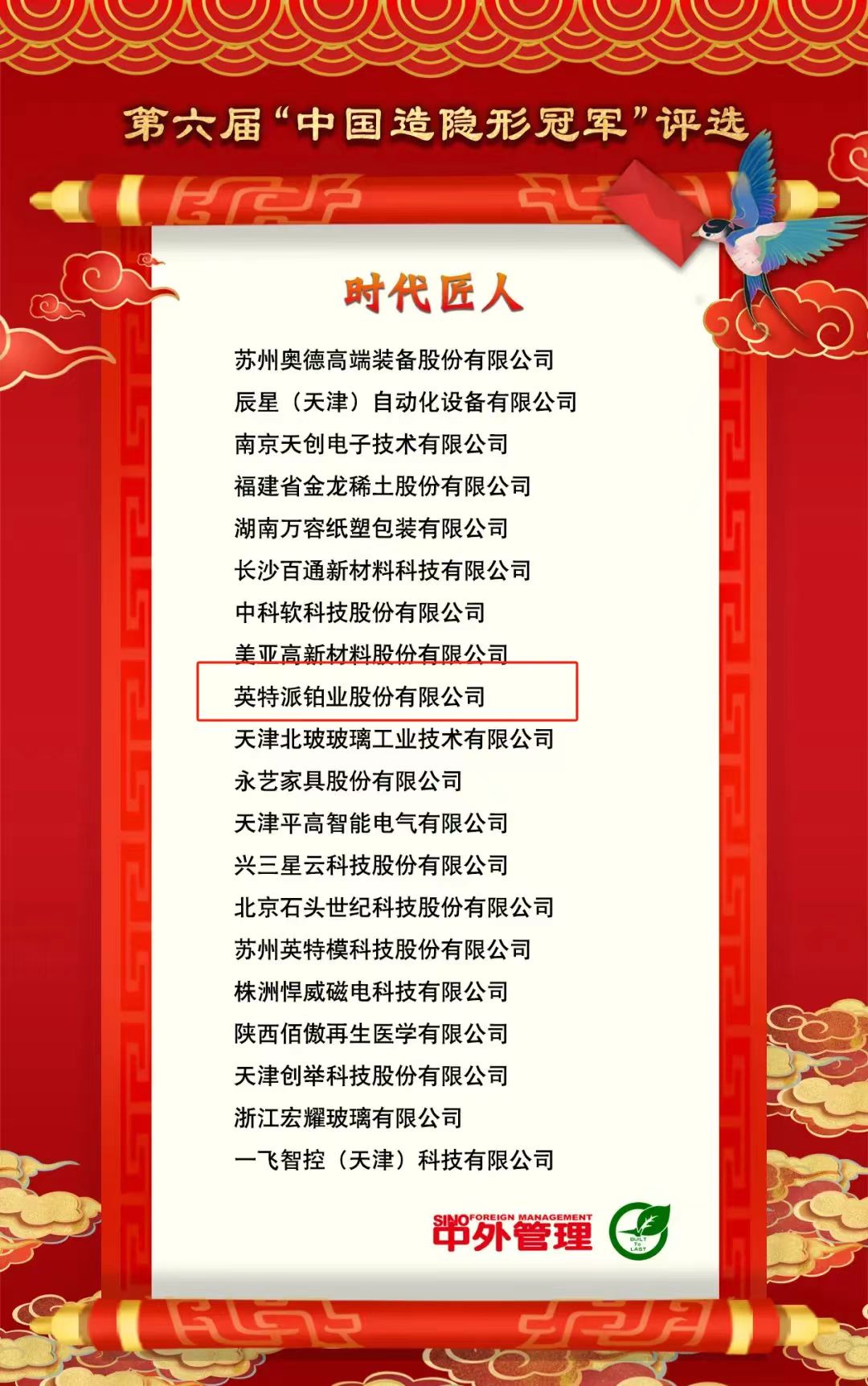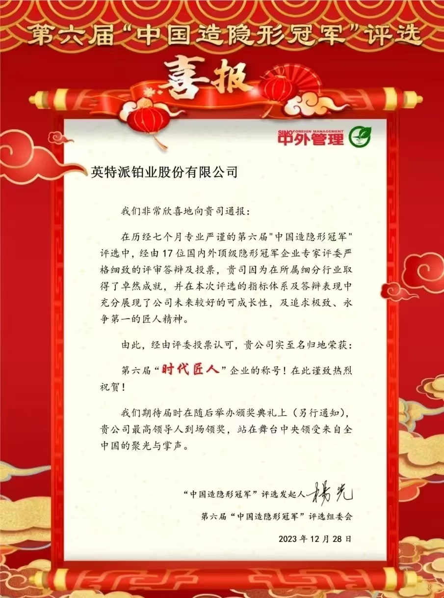 12月19日,第六屆“中國造隱形冠軍”長青懇談會在重慶盛大召開。“中國造隱形冠軍”與國家級專精特新“小巨人”彼此呼應、相輔相成,是專精特新“小巨人”企業(yè)中的塔尖群體。在本次評選中,英特派鉑業(yè)股份有限公司榮獲“時代匠人”稱號。